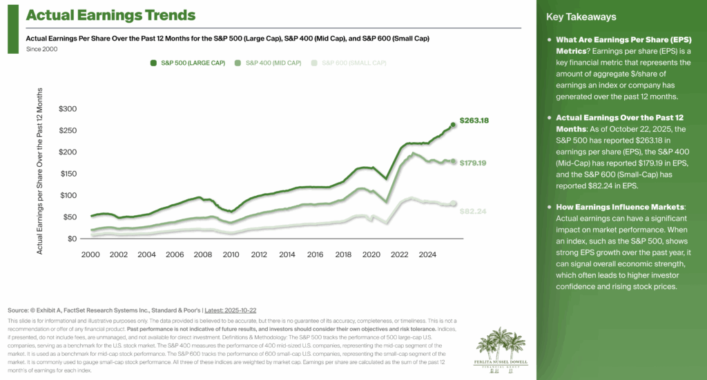 When investors talk about “earnings season,” they’re really talking about one of the most important forces behind stock prices: corporate profits. The chart above highlights how Earnings Per Share (EPS) has trended over the past year across small-, mid-, and large-cap companies — and understanding why those lines move the way they do can help you make sense of the markets.